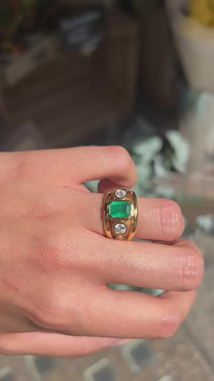 Elegant and eye-catching, this ring is crafted in solid 14kt yellow gold (9.66g total weight), featuring a vivid 1.39 carat emerald-cut natural emerald as its centerpiece. The emerald has undergone minor clarity enhancement with oil, a common and accepted treatment in the trade. Flanking the center stone are two natural round brilliant-cut diamonds totaling 0.52 carats, graded G-H color and VS-SI clarity.
